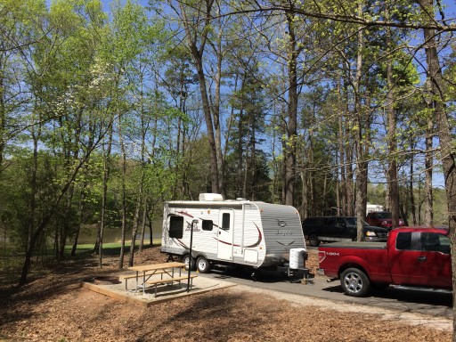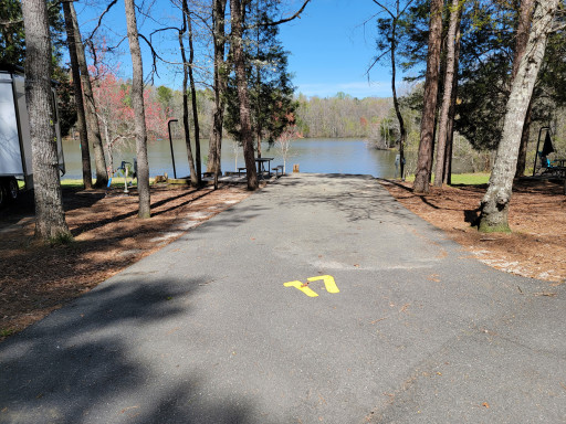 Pros... Good place to stay not far from Charlotte. Staff friendly and helpful. Cons... No sewer hook ups, but dump station is close. Access to campsites tricky in some spots for bigger rigs. Trees close to roadway... We camped here in a 37' 5th wheel.