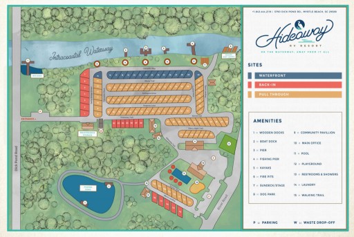 Located on the Intracoastal Waterway, Hideaway RV Resort is a secluded and quiet getaway just minutes away from the beach and is the perfect escape from the hustle and bustle of Myrtle Beach.