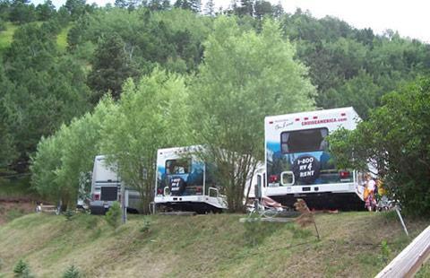 This was a tucked away campsite on a hillside. The park was small and can only accommodate rigs about 40 feet. Call ahead to find out. This wasn't a big deal we just parked separately from our rig. Which was easy enough. The pool, bathrooms and store were nice. The staff really impressed us. They offer a shuttle into Deadwood every hour which i recommend because parking is by meter and difficult to find.