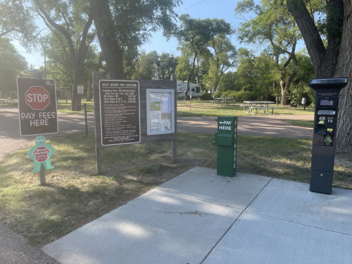 No office, self register with cash in envelopes at entrance, there is a camp host comes around to check. Nice placce for families with play area and lakeside. Some pull-thrus for large rigs and back ins with 3 services. Laundry 2 bucks. Expensive for a city park, discourages families and seniors as there is no discount.