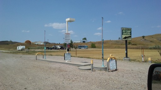 $20 a night self service for rvs only. Exit 98. Right next to 90 so you can hear traffic but if you just need a spot to hang your hat it’s fine. Gravel,even large spaces. Fee includes electric, water & dump. Post office and bar in walking distance and next door military collectibles and old military jet on display. Gas station with reasonable prices next door. There is a public rest stop at next exit but if you don’t want to risk being chased off this is easy and cheap solution. Also better than paying prices next to Wall Drug.
