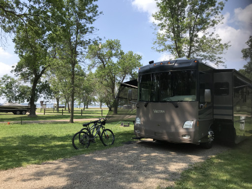 Hot showers. Beautiful lake! Hosts will require back in to site even if you have a small rig. Online payment and reservations required. We did this after we arrived and it was fine. We’re not sure how much we paid as we moved sites after we were told we had to back in and the sites cost different prices. We’re thinking we paid $35-40 for electric only. Water and dump were available. Nice park with free day use and 2pm check out for camping.