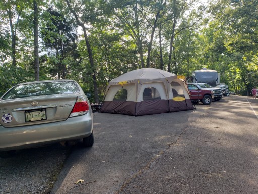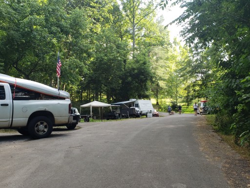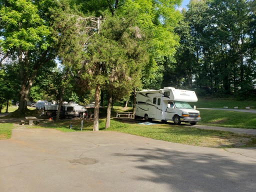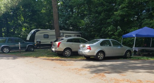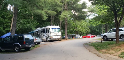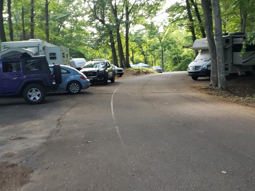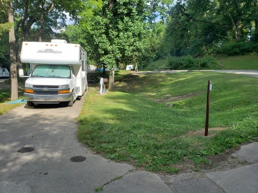 If you camp in 1-43 it is less crowded than the upper level. Not much room for our vehicle but we squeezed it in beside us. Very quiet, well kept. Lots of trees and woods. We had full hookups. Not sure why they dont advertise that. I was expecting only W/E. Easy in and out from interstate. Close to grocery and shops. Would definitely return.