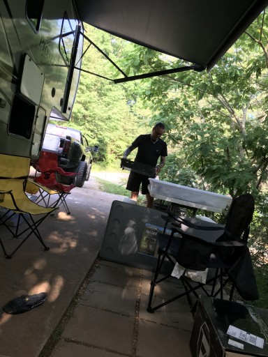 It's a quiet little Park but a lot of either permanent or long-term residents and run-down RVs. Steep narrow gravel Lanes. So keep that in mind. But at least our site was concrete pad. Again very narrow our steps hung over the pad and it was precarious because there was a drop off right next to it. But for an overnight stay maybe even a smaller unit not a bad place to stop for the night very quiet.
