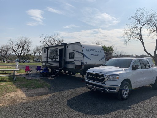 Fredericksburg RV Park great place, friendly staff, park well maintained, sites are gravel but level. Stopped for 3 days ended up staying for 3 weeks. Short distance to Historic downtown. Great plan to be home based to see all surrounding area. Most definitely would stay here again.