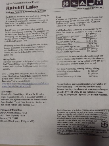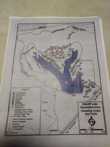 The draw for me was the well-marked and maintained hiking trail loop from the campground through the forest and along Ratcliff Lake.