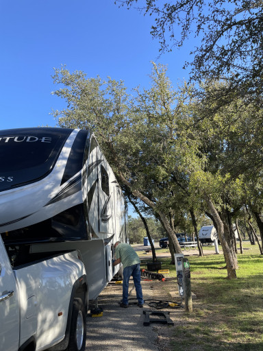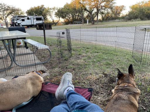 We camped at Comanche trails. Lots of trees and close to the water. RV sites are for 30' and below in length and some of the sites are at 90 degrees with the road so hard to back into. Really nice park and the lake is full.