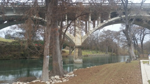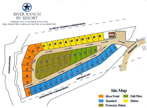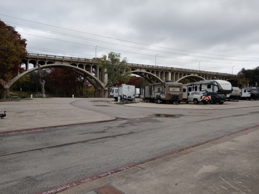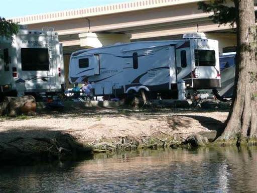 Unique, small, tight but comfortable park on banks of Guadeloupe River. Many long termers and directly under Highway bridges. Noise not a bother inside. Intrusive but not offensive outside. Full HU work fine. ATT svc fine. All concrete sites, modestly level, and paved road. Host Larry is a colorful gem who is gracious and helpful. Stayed in a motorhome with plenty of room for coach and tow. Pricey, but that's the cost of convenience and scenery.