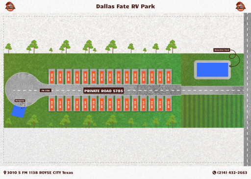 We are a brand new RV Park that opened up in 2023, located near Rockwall, Texas, in Fate, Texas. We service Fate, Rockwall, Lavon, Royse City, and all surrounding Dallas cities.