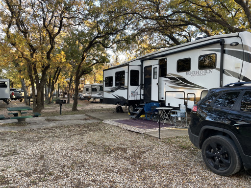 Within minutes of I-35 Exit 328 but totally out in the country with large, open fields and on a creek. All spaces are FHU, level, gravel. We’ll come back.