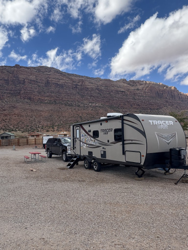 Park conveniently located to Moab and the NPs. Wide 65 ft gravel pull throughs full hookups. No shade Clean modern bathrooms and laundry. WiFi steams well, good cell service on T-Mobile, cable TV although we didn’t use it. Easy in and out. Picnic tables at each site