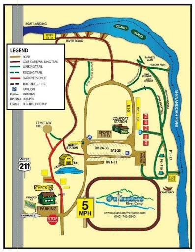 Nice campground that is well maintained with great river access, walking trails, and space. Bath house was clean and heated. Roads are gravel and location is convenient to Luray, VA.
