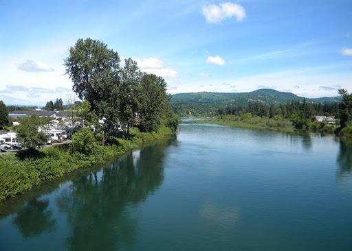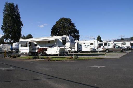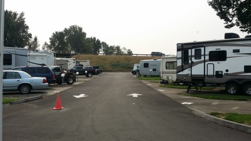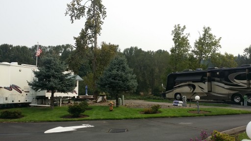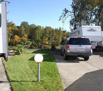 Some if the other reviews here are bogus or meant for another park. This park is well off I-5 and more than a mile out of town so it is pretty quiet. It is entirely paved with wide streets and easy access for my 38 foot motorhome and tow vehicle. Pads are gravel and fairly level. Frontage on the Columbia river in a rural area with a sandy beach for strolling. A very large, well maintained lawn with shuffleboard and horseshoe pits. They also have a small on-site market. Friendly and helpful staff. When I was there the space between units was either dead grass or gravel. Overall, I would go back. Great place for bird watching for herons, eagles, and ospreys as well as a number of raptors in the farm fields.