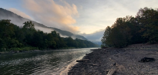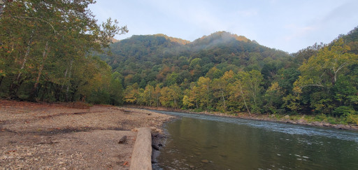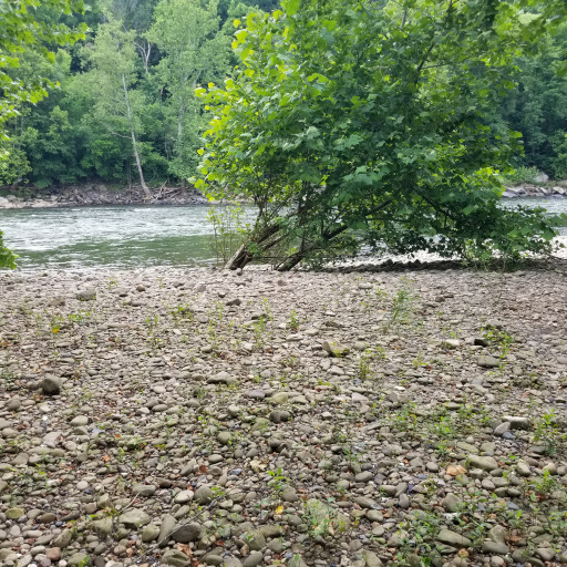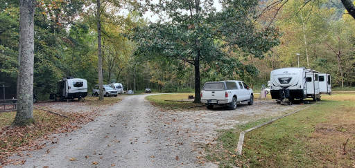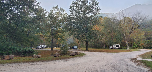 The road in is barely one lane wide. It has low hanging trees and bushes/fences/houses alongside. It almost feels as if you're driving through people's yards at times. A couple of small campers were there and my 10ft high Class C did ok. Campsites are nice size and space. Gravel, firepit, grill, picnic table at each. Easy walk to the river. There are bathrooms but I didn't go in. Seemed clean just glancing in. Beautiful place. My AT&T had one bar sometimes so I couldn't work and couldn't stay.