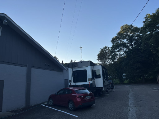 I would say they could fit 4 rigs at most. There are several places with 20amp plugs (2 at the light pole, yellow star) and they have a 30amp plug that they bring outside the back (red star). And another 20amp behind the lodge. There is a water spigot to put water onboard, blue arrow. No dump station.