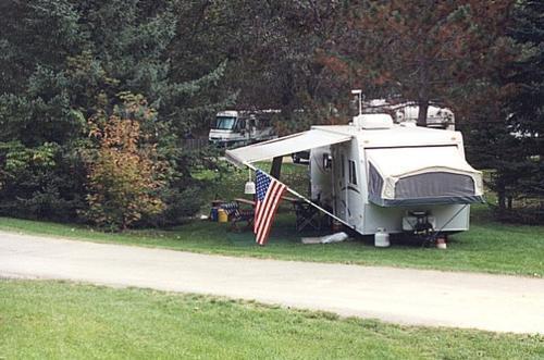 This is a nice private campground with a swimming pool and direct access to the Elroy-Sparta Bike Trail. The pad at the campsite we parked our travel trailer on was fairly level. We needed only to adjust the tongue jack slightly to level the trailer front-to-back (lengthwise); side-to-side was within 1/4” of level when first parked (we use the LevelMate Pro wireless vehicle leveling system). Our pad was dirt/grass and since it had been dry prior to our arrival, was not an issue. The clear (non-potable) rinse water hose for the black water holding tank has a stream sprayer fitting on the end of the hose which cannot be connected to a newer camper’s black water tank flush valve. I’m not sure when the manufacturers started installing those flush valves, but not being able to connect the rinse hose to it prohibited us from taking advantage of the rotating sprayer it’s connected to inside the tank for efficient flushing/cleaning of the black water tank’s interior and walls.