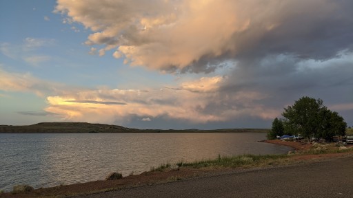 We stopped in for one night on June 29th 2023. We arrived late around 8:30 pm. Drove around to find an open site. Found 3 open, stayed in site 57. Site was level, not to hard to back in our 18 foot trailer. Lot of mosquitoes but you are close to a lake. Antelope walking through the camp. Would stay here again, hopefully longer next time.