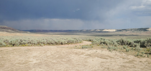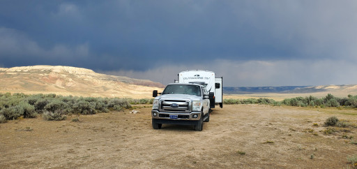 FREE, dispersed campsite on the hill top. Great 360° view. Huge open space that will fit several rigs. Road in from Fossil Butte Rd, .4 mi, was very narrow, steep and rocky. We tow 35' tt and have to put 4x4 just to be safe. Once you make it to the top, you will be rewarded with great views. Unobstructed view of sky for Starlink. This place is perfect if you depending on solar to keep your bateries charged.